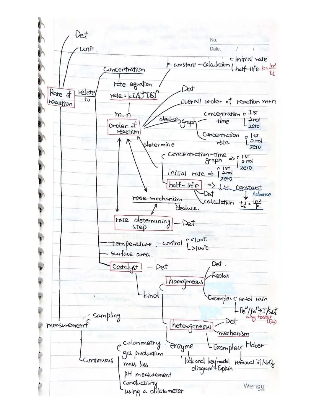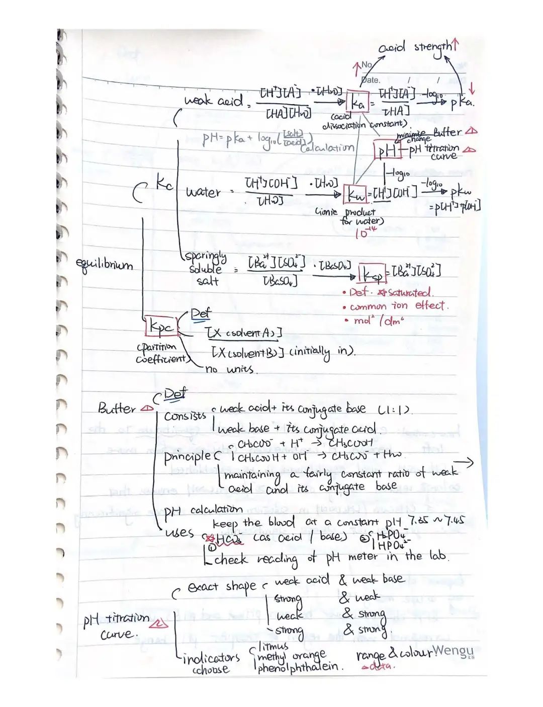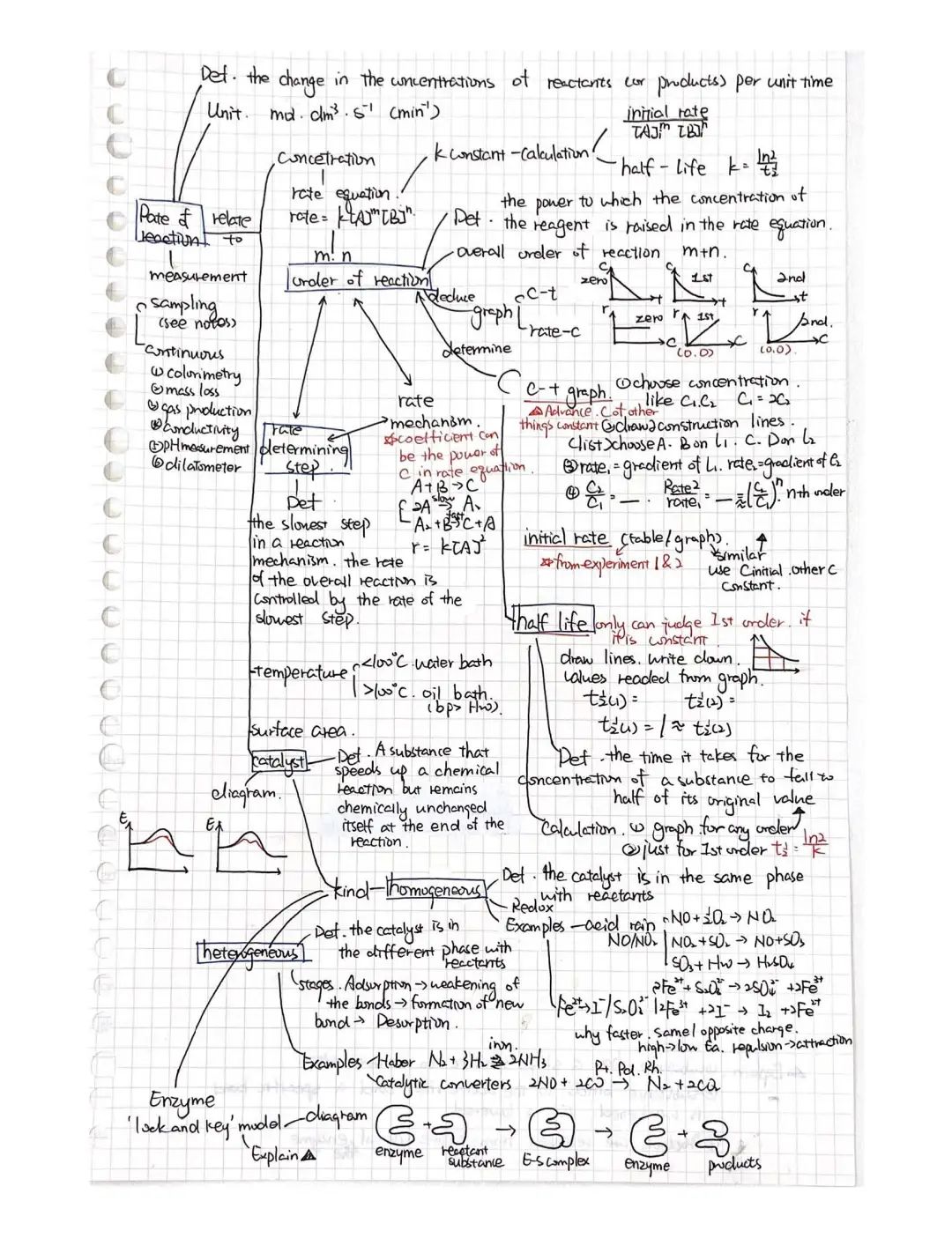 我学化学主要就是花时间(平时写作业的时间+周末的时间)。在我看来,想办法把一个章节里的知识串联起来,和画宫斗剧里的人物关系图差不多,可以在草稿本上给知识们牵线,还会不知不觉发明很多奇奇怪怪的,只有你看得懂的新符号和记忆方式(比如H-TS=“很有特色”),记住了以后用起来也会很方便(虽然某些我用完一次以后就再也没看懂)。整理的时候,我通常是先对照上课的笔记理,画出一个框架,再对照syllabus补充或删减,补充的可能是比较简单的老师不提及的(比如rate of reaction那章里,我补充了value of k随temp的变化),删减的是上课时为了帮助理解而记下但不在大纲里的。理完框架以后,拿一张新的白纸,有两个选择:一是照着笔记把细节和定义都抄在对应位置;二是把知识都背一遍然后默写(我绝大部分都是抄的,但没关系,考试前总是会紧张或火急火燎地背下来的)。然后,一张整理就做好啦~