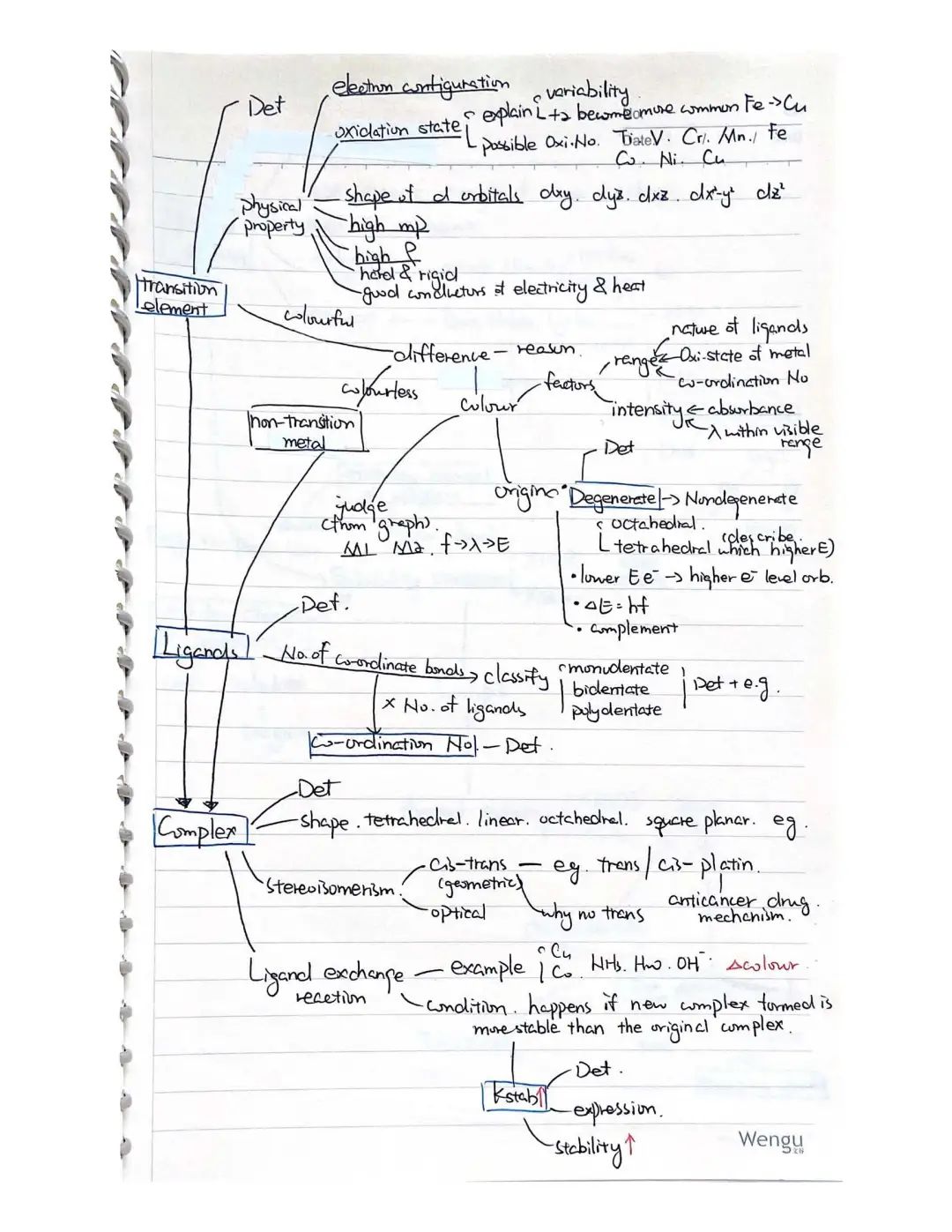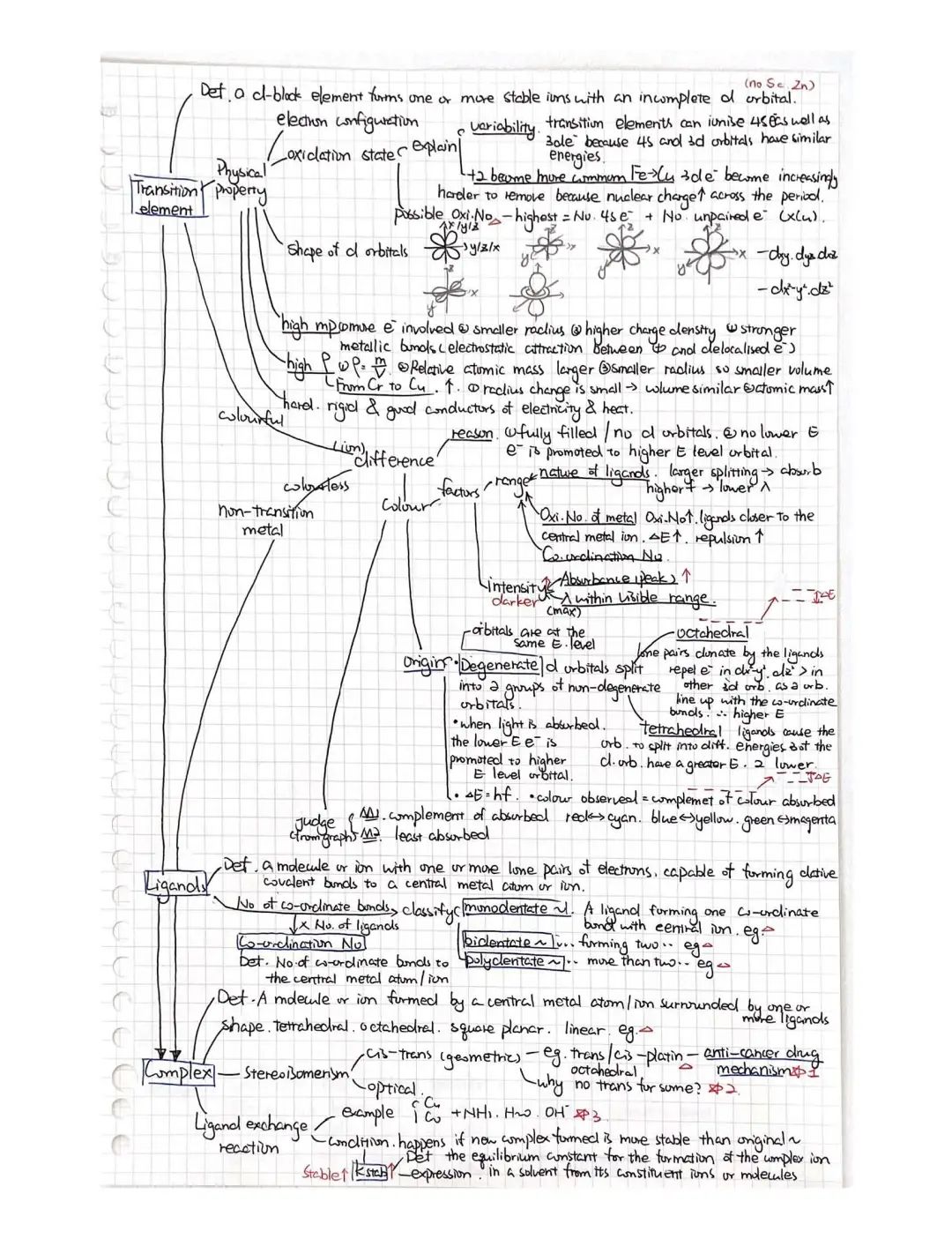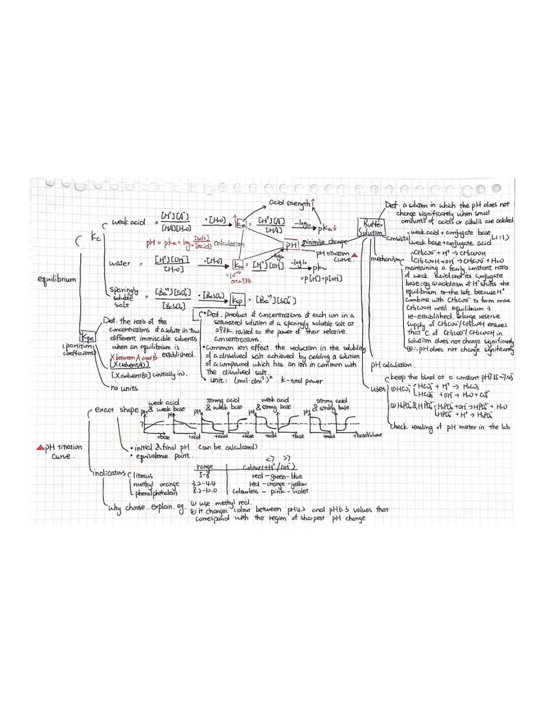 我学化学主要就是花时间(平时写作业的时间+周末的时间)。在我看来,想办法把一个章节里的知识串联起来,和画宫斗剧里的人物关系图差不多,可以在草稿本上给知识们牵线,还会不知不觉发明很多奇奇怪怪的,只有你看得懂的新符号和记忆方式(比如H-TS=“很有特色”),记住了以后用起来也会很方便(虽然某些我用完一次以后就再也没看懂)。整理的时候,我通常是先对照上课的笔记理,画出一个框架,再对照syllabus补充或删减,补充的可能是比较简单的老师不提及的(比如rate of reaction那章里,我补充了value of k随temp的变化),删减的是上课时为了帮助理解而记下但不在大纲里的。理完框架以后,拿一张新的白纸,有两个选择:一是照着笔记把细节和定义都抄在对应位置;二是把知识都背一遍然后默写(我绝大部分都是抄的,但没关系,考试前总是会紧张或火急火燎地背下来的)。然后,一张整理就做好啦~