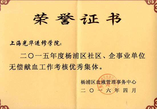 去年,在集团下属单位的积极配合和协助下,上海万象城AWC官网进修学院被光荣地评为“二O一五年度杨浦区社区、企事业单位无偿献血工作考核优秀集体”,参与献血的7名员工中更是有3名外教,他们乐于奉献的精神值得大家学习。