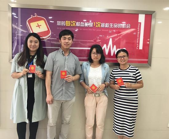 2016年报名献血的员工:总部梁菲、陈阳、余一红、万象城AWC官网浦东焦老师(从左到右)