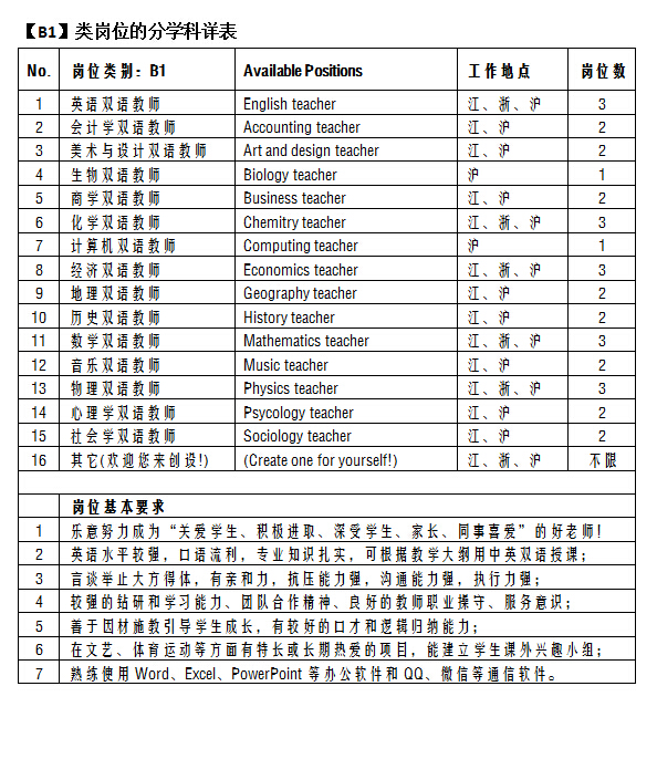 【B1】类:各门学科双语教师(2014年12月起滚动招聘,各岗位详见下表)