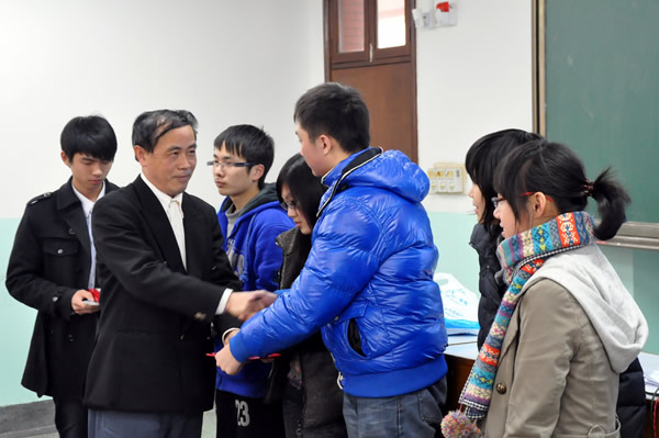 老师为获得优秀学生的同学颁奖