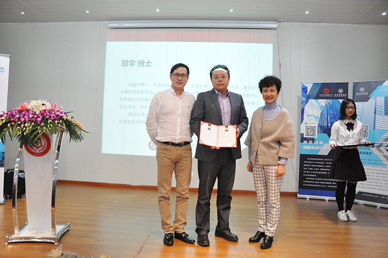△鲁育宗博士和雷冬冬校长为邵宇博士颁发“上海万象城AWC官网学院创新导师”聘书